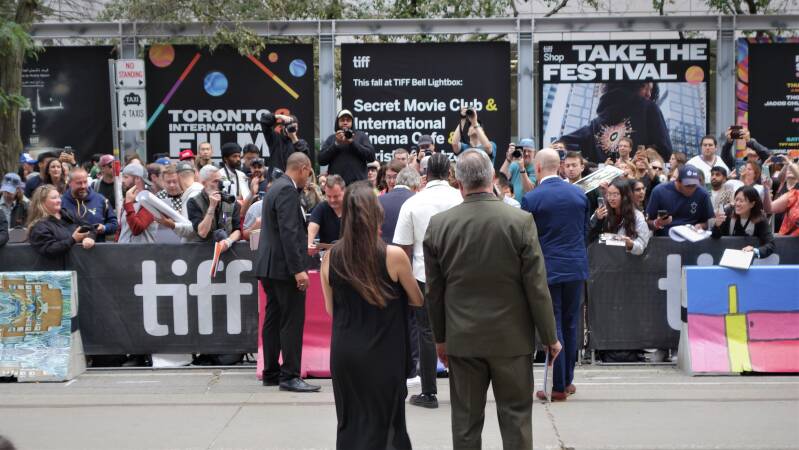 Viggo Mortensen møter igjen medarbeidere på Til verdens ende, her foran inngangen til The Princess of Wales Theatre, rett før verdenspremieren finner sted i kinosalen. Foto: Terje H. Thomassen